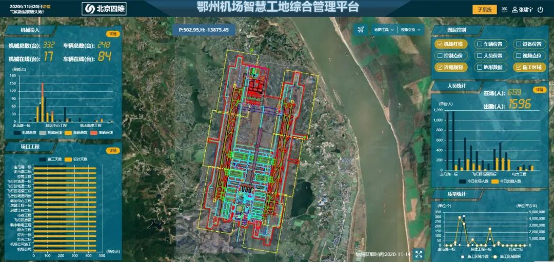 走进湖北国际物流机场有限公司工程指挥部,来到数字中心大厅,首先映入眼帘的便是LCD大屏幕,上面运行着“鄂州机场智慧工地综合管理平台”,平台有不同模块,包括工期进度、当日人员、机械、车辆具体数目的图表等,20平方公里的施工现场,施工人员忙碌的身影、繁忙作业的设备、来回运输物料的车辆……一切尽收眼底。“当几千余名施工人员、几百辆车以及几百台作业设备位置信息全部显示在管理平台时,那一刻的心情相当激动。”软件工程师肖观长说。