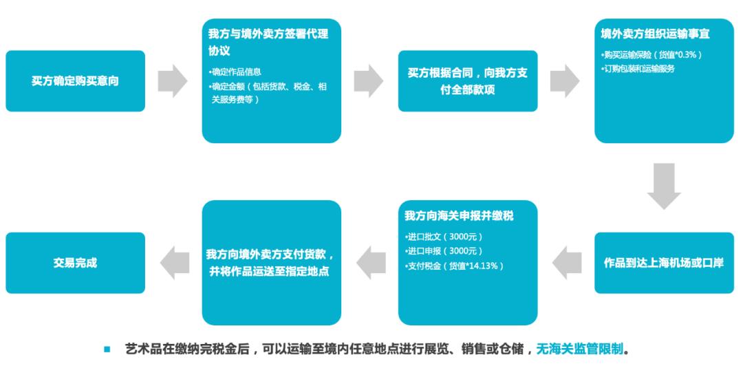 一件艺术品的生产运输流程非常不容易。境外艺术品要来交易,第一步确定购买的意向,确定作品信息、金额,包括了货款税金,相关的服务费用,要签定买方合同,然后开始进入到境外担保运输。