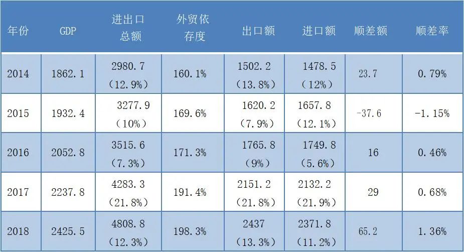 注:上列各项(除外贸依存度、顺差率以外)的单位为“亿美元”;进出口总额、出口额、进口额三列括号中的数字是相对于上一年度的增长率。