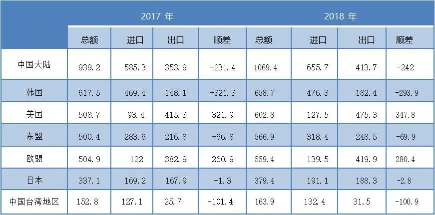 表2是2017-2018年越南与其主要贸易对象的贸易数据(亿美元)