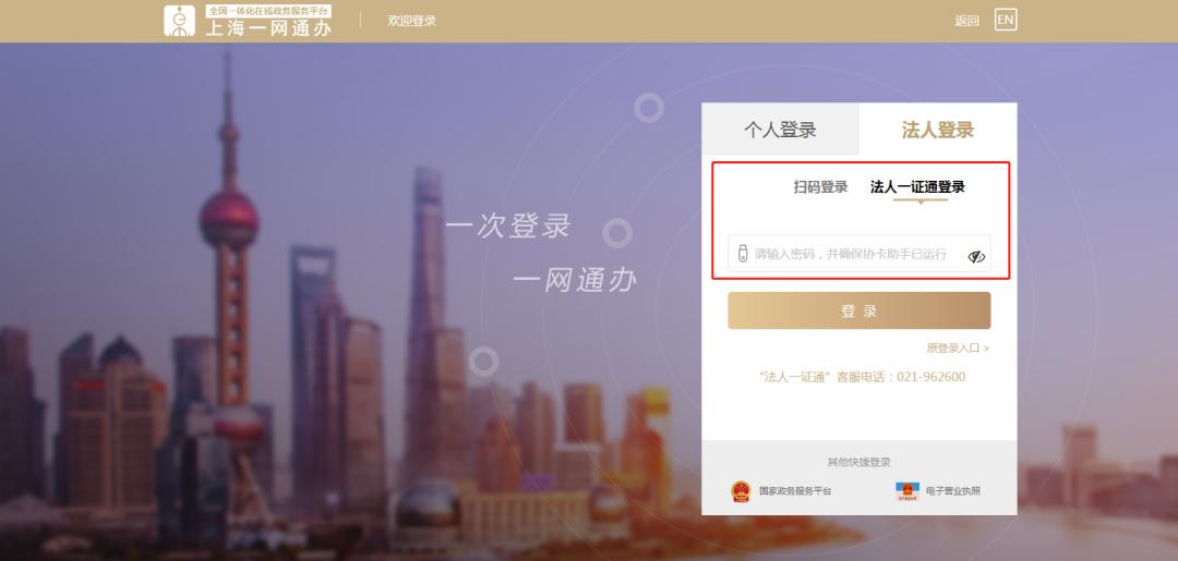 经“法人一证通”登录上海市一网通办官网(http://zwdt.sh.gov.cn/govPortals/index.do)