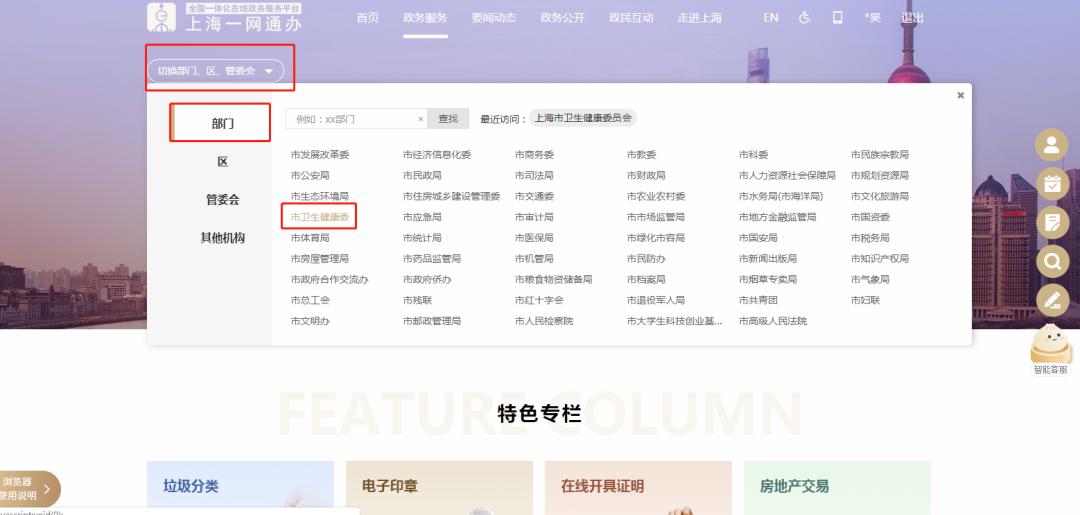 选择部门:市卫生健康委,进入“上海市职业健康管理服务平台”