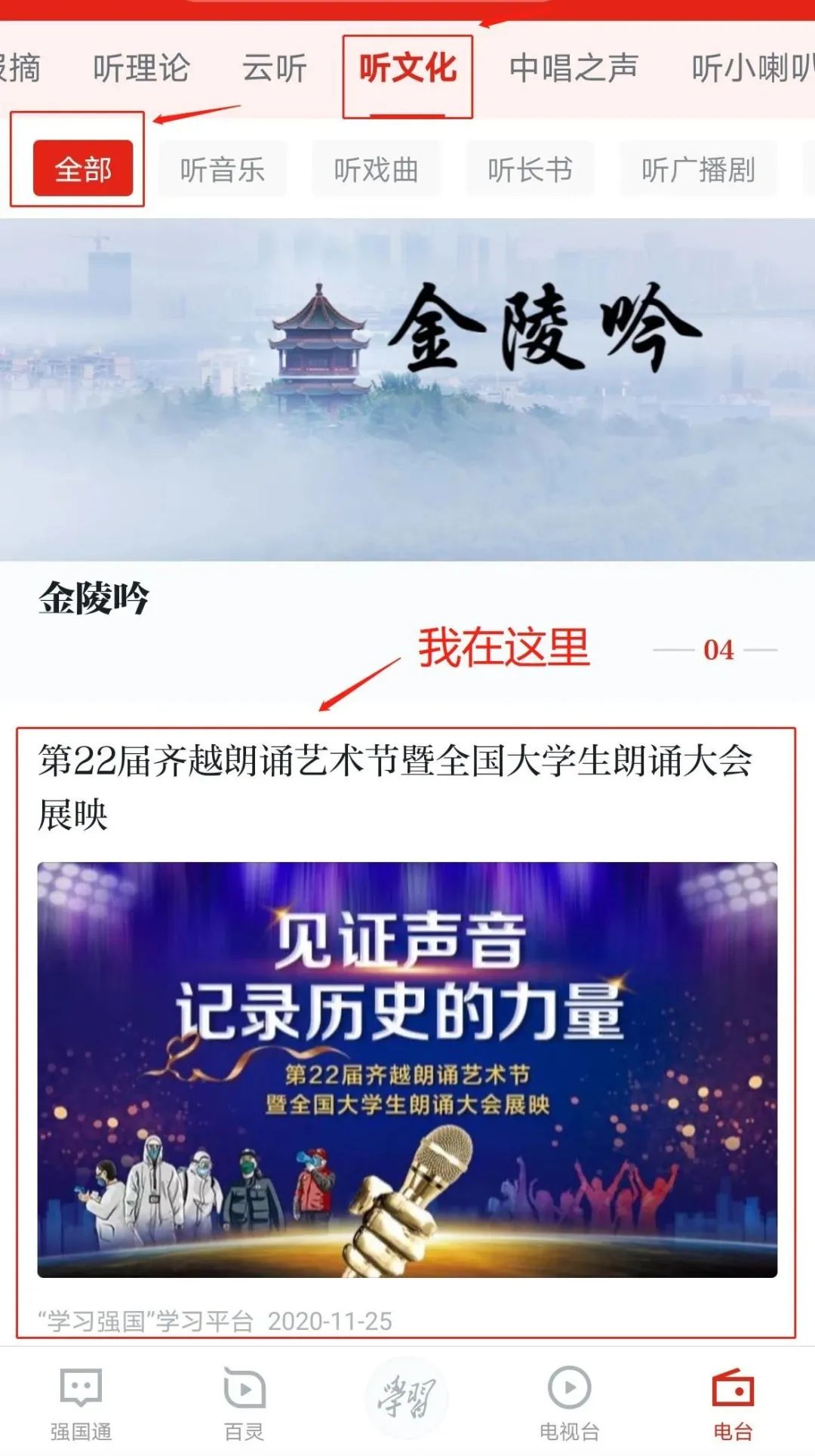 第二步:拖动上端频道栏,找到“听文化”频道下的“全部”栏目。置顶区下方可见“第22届齐越节暨全国大学生朗诵大会”展映。