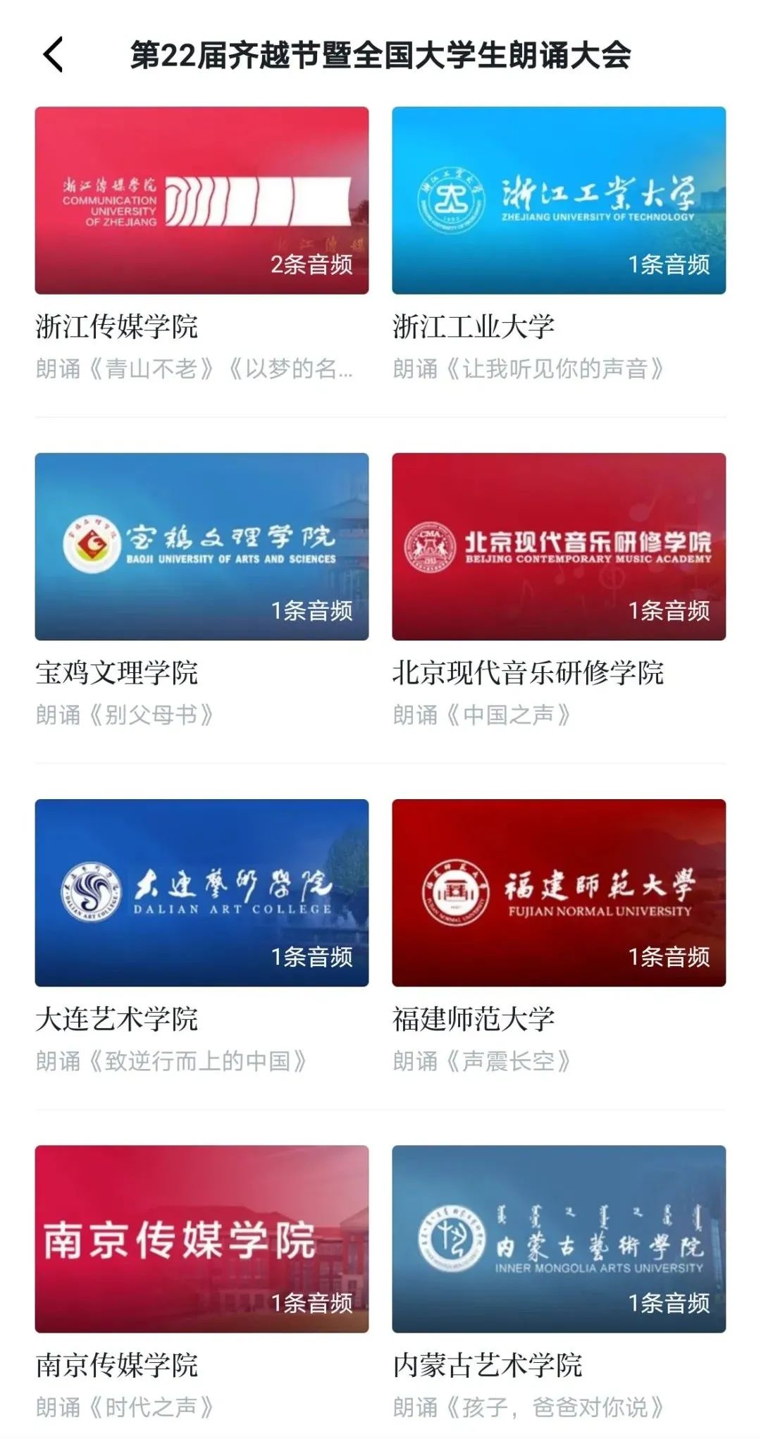 第三步:点击专题进入,可看到各个高校的参赛音频专辑。点击倾听吧!
