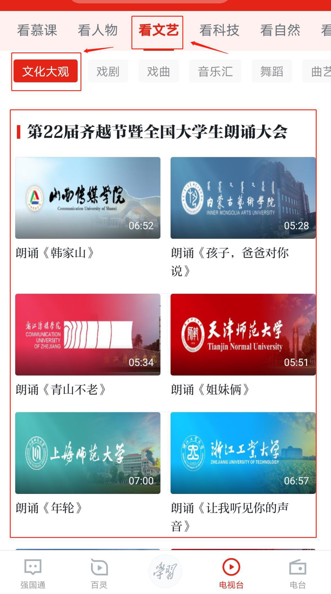 第二步:找到“看文艺”频道二级栏目“文化大观”。栏目下可见“第22届齐越节暨全国大学生朗诵大会”专题。