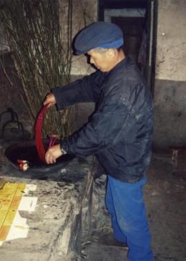 将染过颜料的竹篾放在锅里加水煮上10至20分钟,如此染料才不致脱落。