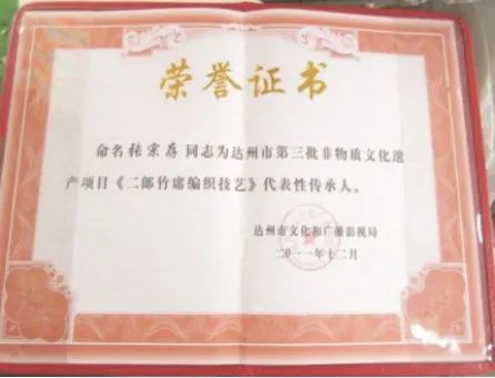 2011年12月,二郎乡竹席编织人张宗存被达州市文化和广播影视局命名为达州市第三批非物质文化遗产项目《二郎竹席编织技艺》代表传承人。