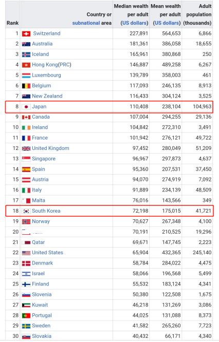 韩国也不差,成年人中位数净财富也超过了7万美元,与意大利、挪威等国相当。