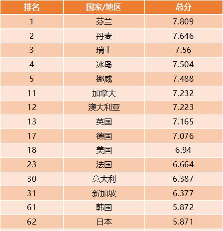 英法德普遍在10-30名。芬兰、丹麦、瑞士等国更不用多说,包揽了前5。