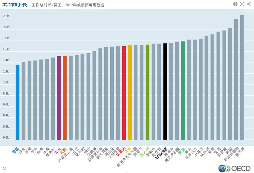 据经济合作发展组织(OECD)数据,38个成员国中,德国职员年工作时间最短,为1356个小时。