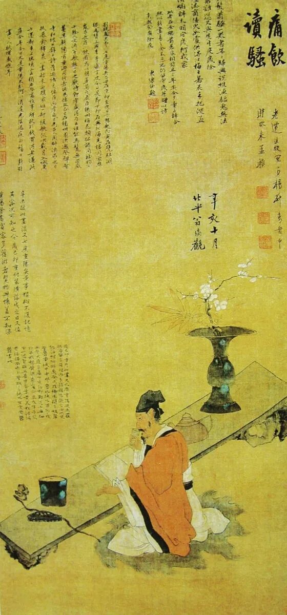 前人有“上马横槊,下马作赋,自是英雄本色;熟读《离骚》,痛饮浊酒,果然名士风流”的说法。老莲的这幅画以痛饮读骚为意,正有这种沉郁顿挫的意思。