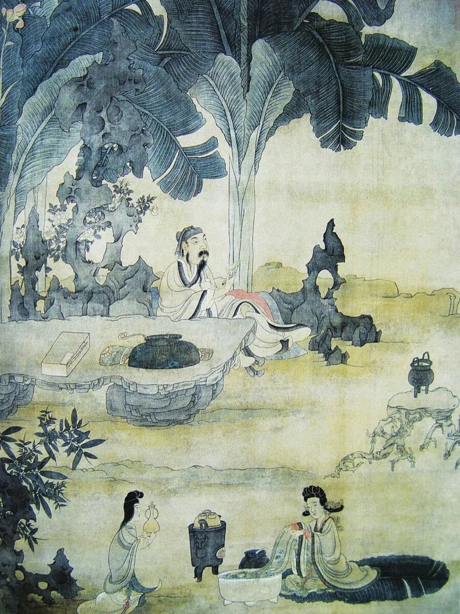 《蕉林酌酒图》中的主人公手执酒杯,坐在山石做成的几案前,高高的宽大的芭蕉林和玲珑剔透的湖石就在他的身后,而那位煮酒的女子,正将菊花倒入鼎器中,她就坐在一片大芭蕉叶上,如同踏着一片云来。老莲以篆籀法作画,古拙似魏晋人手笔。