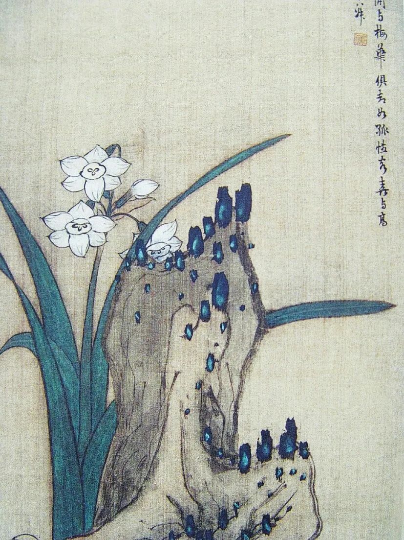 现藏于苏州文物商店的《水仙灵石图轴》,是一幅设色画,画湖石背后有水仙一丛,叶片以石青敷成,花朵填以白粉,花不多不大,但却影影绰绰,灼目而忧伤,令人难忘。