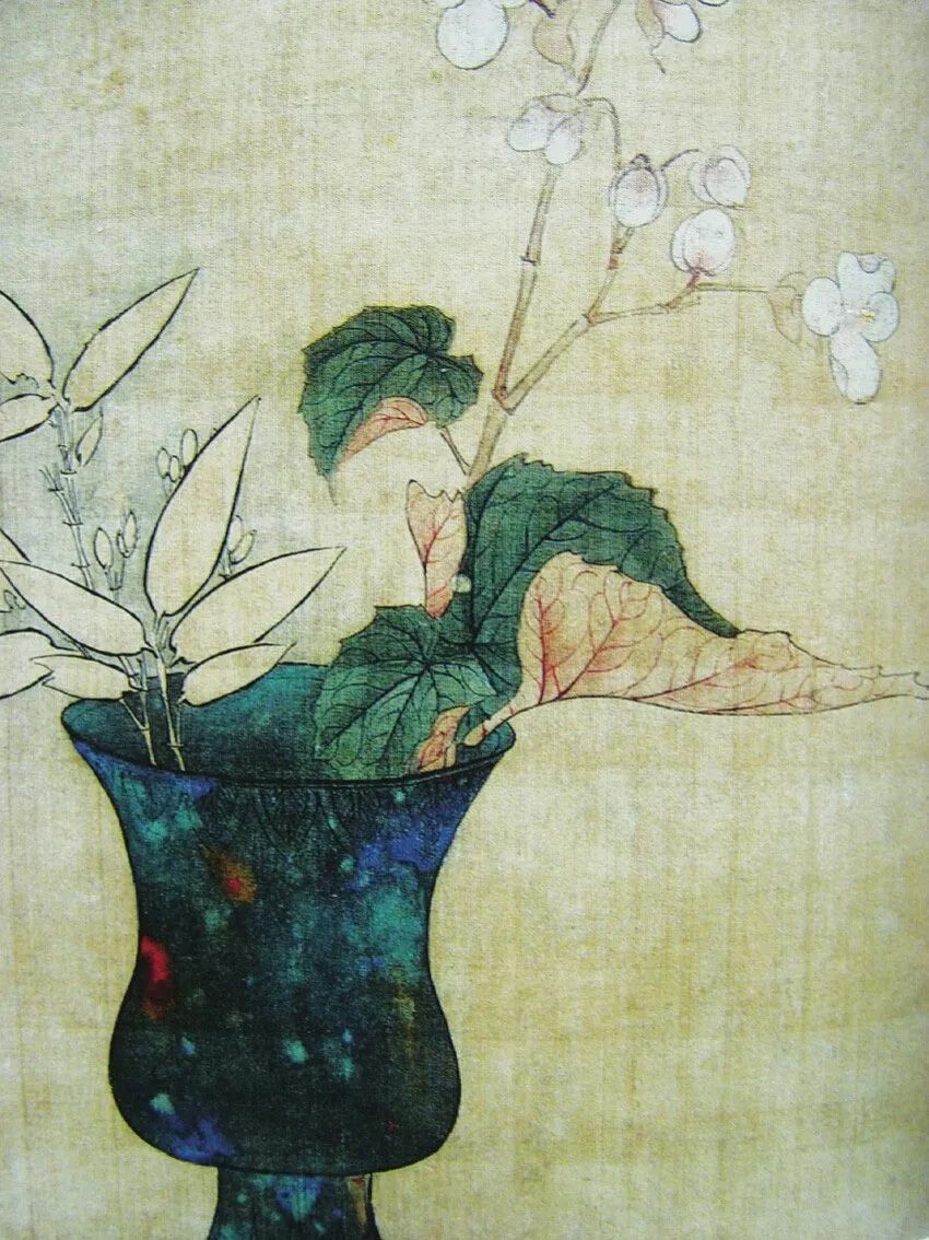 图写梅、竹、菊、玉簪等花卉,其中第四幅,构图极简洁,画一铜制花瓶中插海棠一枝、竹叶数片。铜瓶锈迹斑斑,极显其高古之态。整个画面古淡幽雅,气氛冷逸。