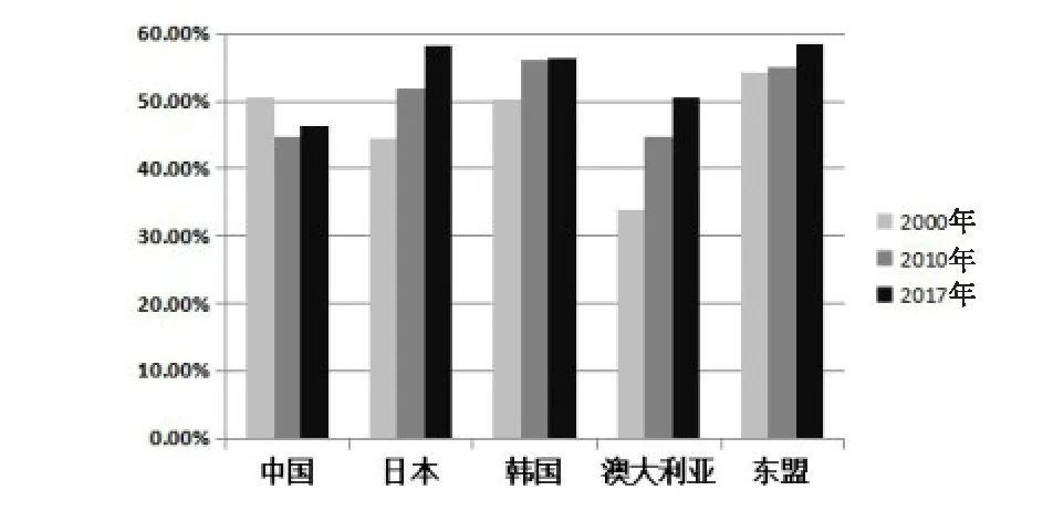 首先,RCEP经济体制造业的增加值来源内向化趋势明显。当前,学界普遍使用出口总值增加值(国内增加值DVA)来衡量一国制造业的竞争力水平,如果一国某行业出口的国内增加值多,则代表该国在该行业的全球价值链体系中获利能力较强。如果对一国国内增加值(DVA)的来源进行追踪,就可以找到对该国该产业具有巨大贡献的区域和产业来源。因此,对RCEP经济体各自制造业2017年的国内增加值(DVA)进行追溯后发现,所有国家的国内增加值均主要来源于RCEP经济体内部。研究发现,中国、日本、韩国、澳大利亚和东盟国家制造业的国内增加值基本上都来源于亚洲,占比达到了七成左右,其余三成来自欧洲、美洲、世界其他地区。这说明RCEP经济体出口增加值高度集中在RCEP区域内部,制造业的发展高度依赖区域内部经济发展。其次,RCEP经济体制造业生产和市场网络的内向化趋势明显。通过对RCEP经济体的中间产品和最终产品地区流向进行追踪后发现,其流向高度集中在区域内部(图1、图2)。以日本为例,RCEP区域是其中间产品和最终产品的主要流向目的地,而且趋势越发集中,2000年RCEP区域吸收日本中间产品的份额为44.46%,到2017年该份额上升至58.32%;2000年RCEP区域吸收日本最终产品的份额为42.26%,该份额到2017年快速上升至65.12%,这意味着日本制造业中间产品中有将近六成流向RCEP区域,超过六成五的最终产品流向RCEP区域,说明日本制造业的生产网络和市场网络高度集中在该区域内部。综上所述,RCEP经济体的国内增加值来源、生产和市场网络发展均呈现显著的内向化特征,为区域价值链重构提供了硬件基础。