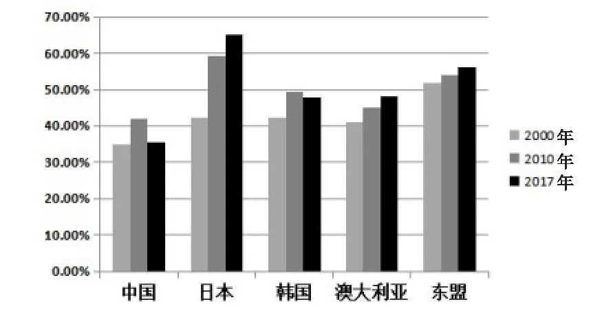 首先,RCEP经济体相互依赖的不对称发展趋势系潜在的威胁。近二十年来,RCEP经济体间的相互依赖关系发展呈现以下规律:第一,中国与RCEP经济体间的相互依赖关系呈现不对称发展趋势。从双边贸易份额的变化情况可以看出(图5),中国与日本、韩国、澳大利亚、东盟间的相互依赖都呈现不对称发展的趋势。如2017年中日贸易占中国的份额从原来的17.53%下降至7.38%,而占日本的份额却从原来的9.68%上升至22.13%,这说明中国和日本的相互依赖关系出现了逆转,从“中国依赖日本”转向“日本依赖中国”。第二,RCEP经济体对中国的依赖在增强,对日本的依赖在减弱(图6)。中国、韩国、澳大利亚、东盟等对日本的依赖程度在下降,如日本对东盟的依赖并没有发生太大变化,但东盟对日本的依赖却发生了显著的变化,双边贸易占东盟的份额从2000年的32.32%下降至2017年的8.03%;韩国与日本的经济相互依赖关系发展也呈现同样趋势。经济相互依赖理论认为“不对称相互依赖关系是权力的主要来源”,而相互依赖关系中的依赖方向发生逆转将可能导致体系内出现权力的转移,打破体系内经济体间的平衡关系从而引发体系出现不稳定的因素。在RCEP经济体内部,这种体系内权力转移的现象正在出现,原本由日本主导的地区经济发展模式被打破,权力从日本转移到了中国,原本以日本为中心的经济相互依赖体系向以中国为中心的体系转变。其次,价值链“攀升国”与“守成国”间的博弈加剧是潜在的威胁。以日韩贸易冲突为例,可以带来两点启示:一是韩国在光电设备制造业领域的迅速崛起和发展,使日本在该领域的地位相对下降,这种“心理落差”是事件爆发的重要原因;二是日本也在步美国后尘,“武器化”使用贸易工具(Henry Farrell,Abraham L.Newman,2019),通过极限施压的方式来压迫竞争对手。日本抓住了韩国经济命脉(光电设备制造业),利用韩国该行业对日本原材料的高度依赖关系作为打压手段,企图以极限施压的方式迫使韩国屈服。这说明“攀升国”与“守成国”间的博弈可能会成为“新常态”,“守成国”利用优势对“攀升国”进行施压甚至威胁可能成为潜在的风险。当前,中国的高端制造业已经深度嵌入到由日本、韩国等国家主导的全球价值链分工体系中,虽然中国制造业得到了发展,但分工地位仍然处于相对弱势,增加值的获利能力远不及日本和韩国。随着未来中国制造业的高端攀升,在有可能触及日本、韩国等“守成国”既得利益的时候,不排除“守成国”利用“经济工具的武器化”对“攀升国”进行施压的可能。综上所述,经济相互依赖关系的逆转、“攀升国”和“守成国”间的博弈加剧等问题可能成为RCEP区域价值链重构中的潜在风险。