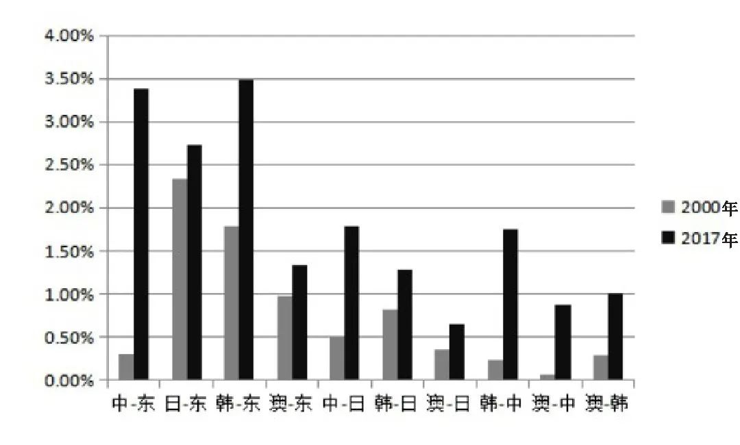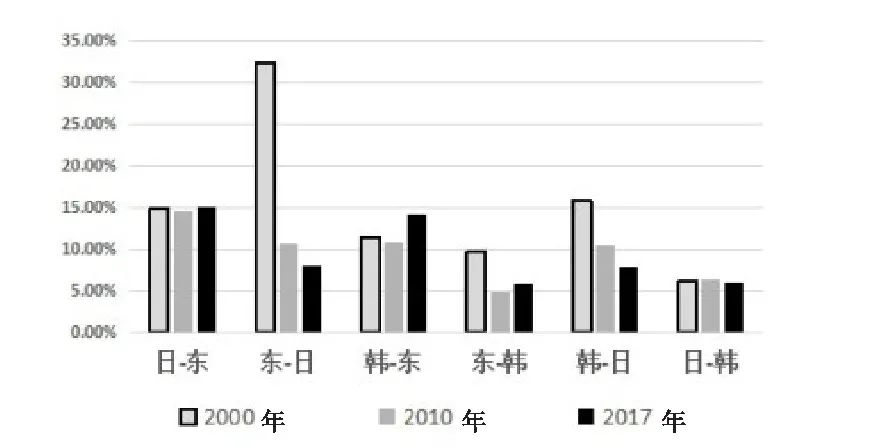 图6 日本、东盟、韩国间的双边贸易份额变化