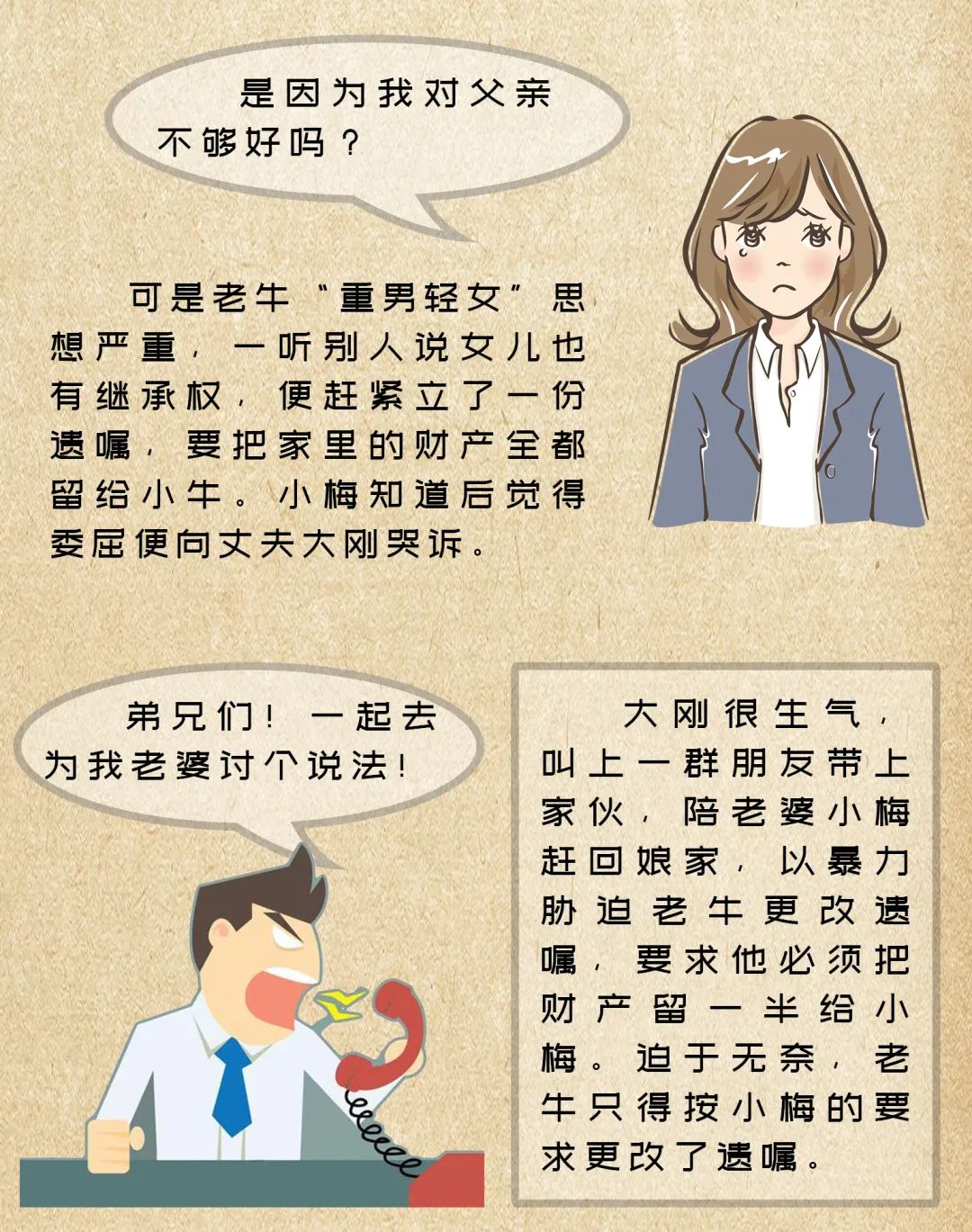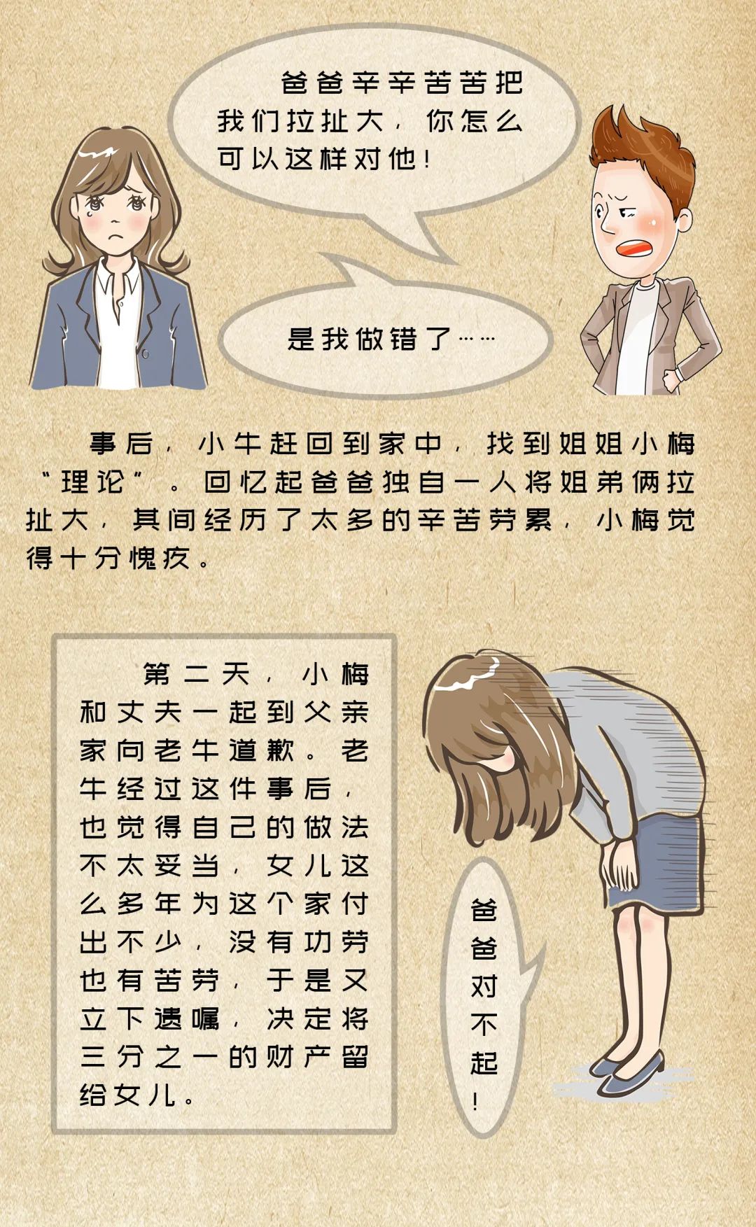 但是,考虑到被继承人与继承人之间系亲密的亲属关系,如果继承人已经认识到了自己的错误且有悔改表现,被继承人也对继承人表示宽恕,愿意让其继承自己的全部或部分遗产,那么法律也应当尊重被继承人的意愿,这也有利于维护和谐的家庭关系。因此,民法典继承篇完善了继承法上的宽恕制度,给予继承人改过自新的机会,体现了法律力度与温度的融合。具体来讲,宽恕制度是指除故意杀害被继承人和为争夺遗产而杀害其他继承人两种极其严重的犯罪行为外,继承人有其他丧失继承权的行为,但确有悔改表现,被继承人表示宽恕或者事后在遗嘱中将其列为继承人的,该继承人不丧失继承权。案例中,小梅作为继承人,虽然有以胁迫手段迫使父亲老牛变更遗嘱、情节严重的行为,但之后小梅向父亲表示悔改,老牛事后在遗嘱中将小梅列为继承人,把三分之一的财产留给她。那么依据民法典的规定,小梅不丧失继承权,仍有权继承老牛的遗产。