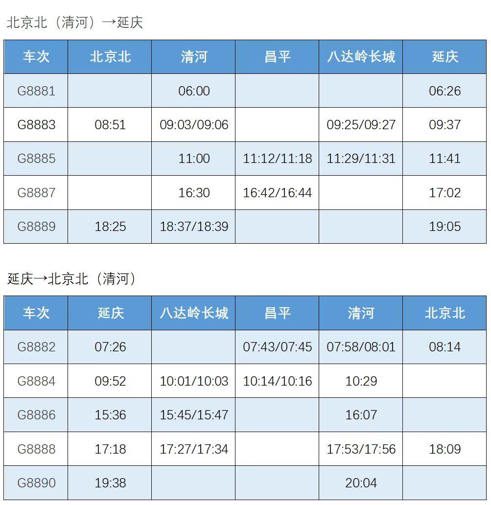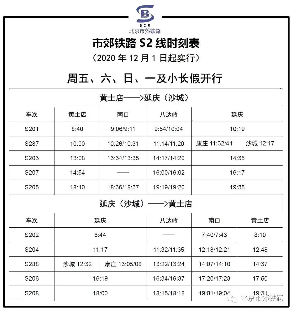 延庆站同步接入S2线市郊列车,每周二、周三、周四黄土店到延庆开行3对,周五、周六、周日、周一、开行4对。