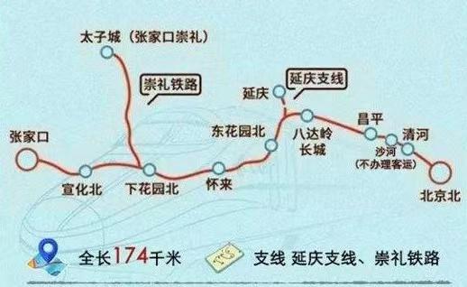 京张高铁是2022年北京冬奥会的配套工程,京张高铁从北京枢纽北京北站引出,铁路全长174公里,全线共设北京北、清河、沙河、昌平、八达岭长城和张家口等10座车站。