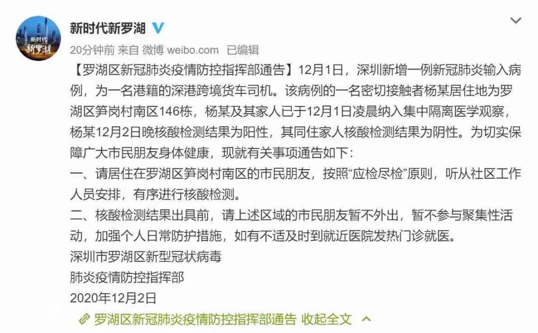 4)深圳深夜通报:12月2日,深圳新增1例与香港输入病例关联的无症状感染者,系12月1日确诊港籍跨境货车司机陈某的密切接触者。