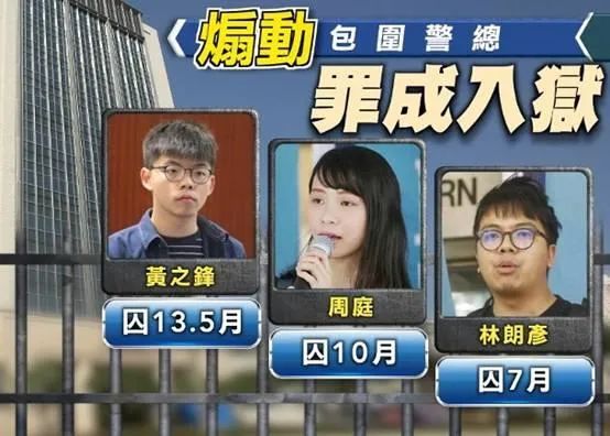 2)黄之锋、周庭及林朗彦,涉嫌去年6月21日包围香港警察总部,早前分别承认煽惑、组织及参与未经批准集结等控罪,案件昨日下午在西九龙裁判法院宣判。黄之锋被判入狱13个半月,周庭被判入狱10个月,林朗彦被判入狱7个月。