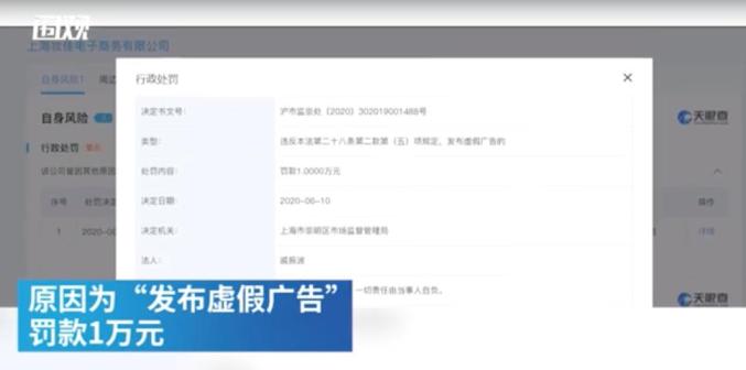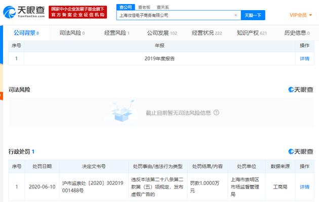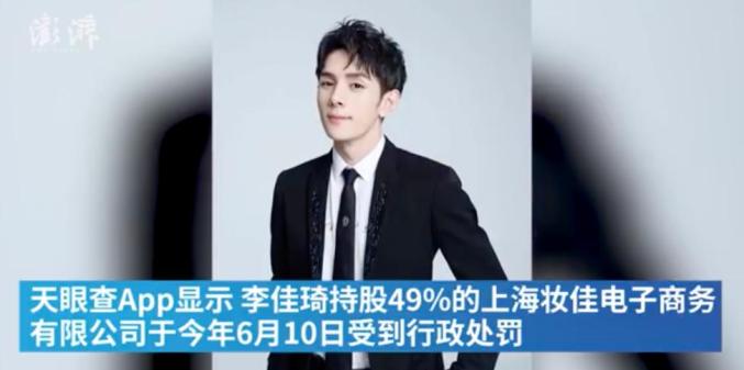 据某商业查询平台显示,李佳琦持股49%的上海妆佳电子商务有限公司于今年6月10日受到上海市崇明区市场监督管理局行政处罚,原因为“发布虚假广告”,罚款1万元。