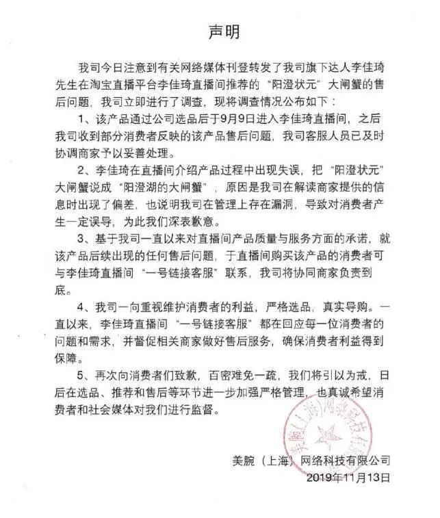 2019年,李佳琦就因直播间所推荐大闸蟹涉嫌虚假宣传登上热搜。2019年11月13日下午,李佳琦工作室官方微博发布声明回应此事。