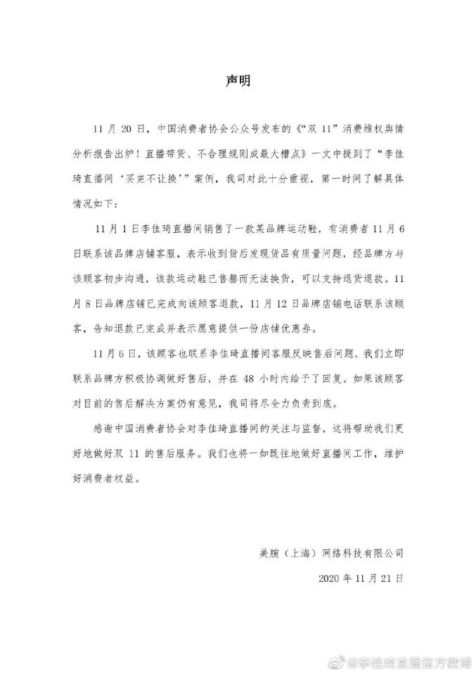 11月20日,中国消费者协会发布“双11”消费维权舆情分析报告,点名李佳琦直播间“买完不让换”。
