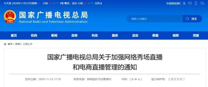 针对直播乱象,11月23日,国家广播电视总局发布了《关于加强网络秀场直播和电商直播管理的通知》。