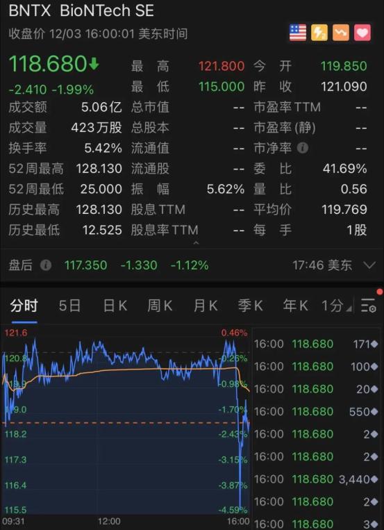 周四,辉瑞收盘下跌1.74%,其合作伙伴BioNTech下跌1.99%。