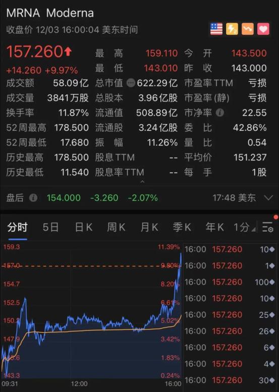 而其竞争对手Moderna尾盘暴涨,收涨10%,股价创新高。