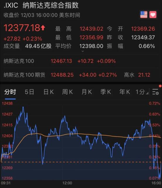 纳斯达克指数涨0.23%,报12377.18点,小幅刷新盘中及收盘的历史新高。