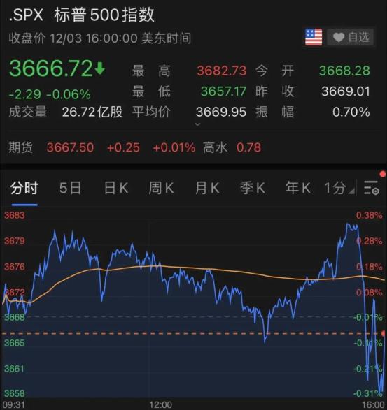 标普500指数创下盘中新高,截至收盘跌0.06%,报3666.72点。