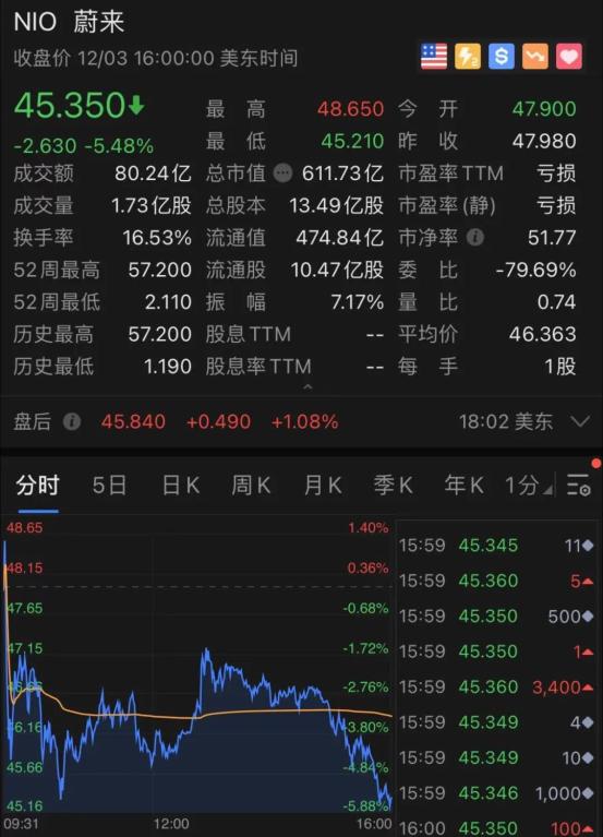 蔚来汽车跌5.48%,市值蒸发35亿美元,约合230亿人民币。