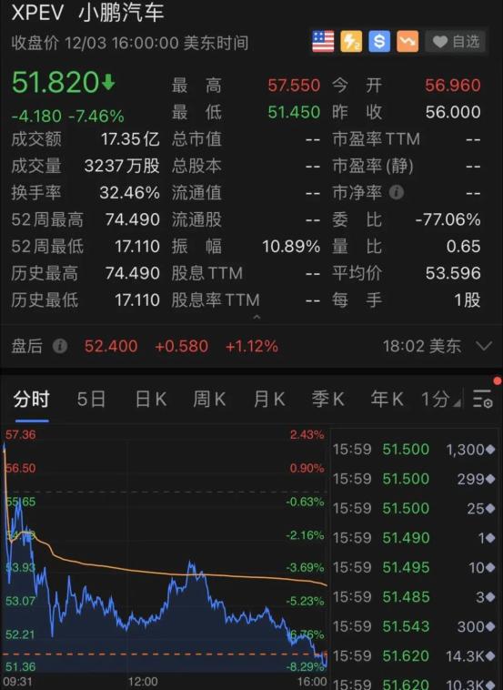 小鹏跌7.46%,市值蒸发30亿美元,约合200亿人民币。