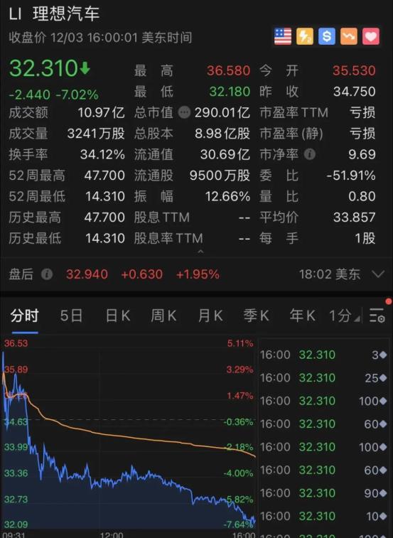 理想汽车跌7%,市值蒸发22亿美元,约合144亿人民币。