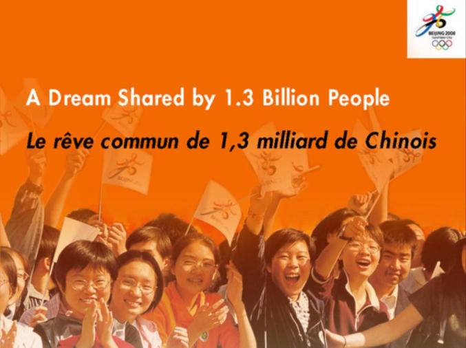 还有我们的主题,我从何振梁先生的演讲稿中提取了一句话做陈述报告的题目,它也成为整个陈述最精髓、最关键、最重要的信息:“13亿人的梦想!”,把13亿人带进奥林匹克大家庭,这是在申奥过程中一个最能打动人心的口号!