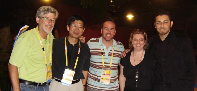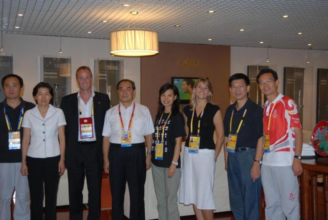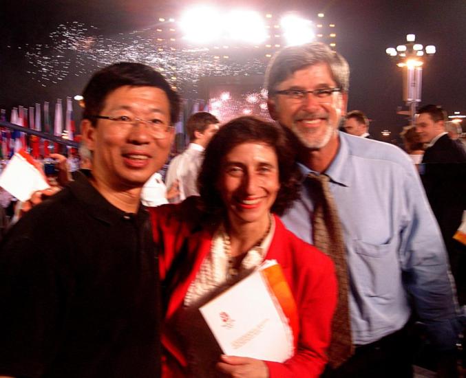 王敏与雅典奥运会艺术总监Theodora Mantzaris(中)、国际奥委会形象与景观顾问Brad Copland(左一)