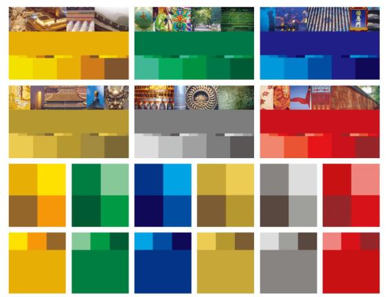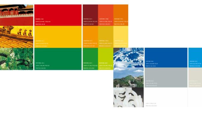 经过无数的会议与漫长的设计,最后我们确定了色谱,给主要的颜色都赋予了特有名称:中国红、琉璃黄、国槐绿、青花蓝、长城灰、玉脂白。这些名称让2008北京奥运会的色彩有了自己的专有属性,有了生命力,有了理念,有了故事。奥运之后,“中国红”被大家用的越来越多,尽管色彩与我们所用的成分不尽相同。