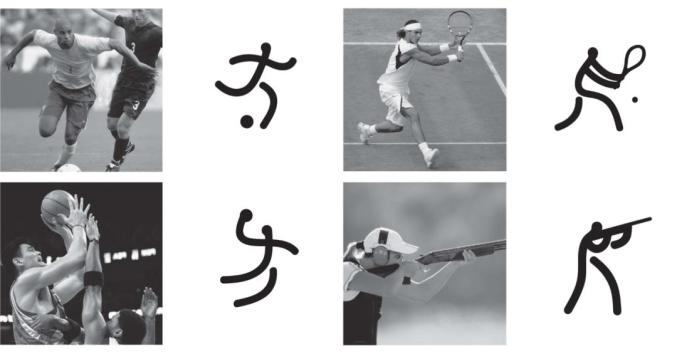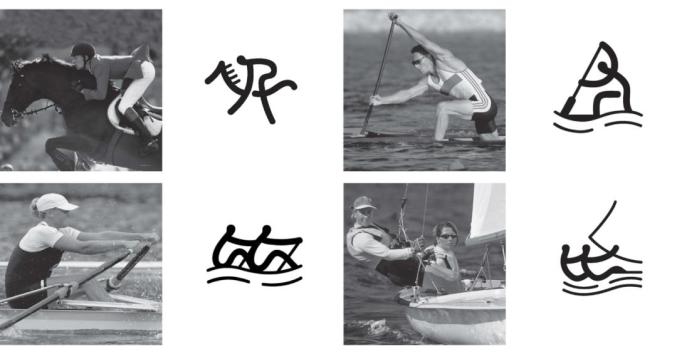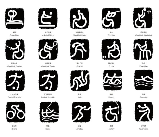 单项体育标识在奥运会期间也特别的重要,因为每一个比赛项目都要用这个标识来代表。当时竞标的时候,我们美院的学生分了很多团队,王捷做出马术等几个草稿之后我们很兴奋,因为我们尝试过用水墨、用剪纸、用书法、用瓦当图案等传统风格,篆字是最好的选择。因为单项体育标识的英文是“Pictogram”,也正是“象形文字”的意思,而且它既像中国文字,可识别性又很强。王捷那时还是学生,现在已经是中央美院的教师了。