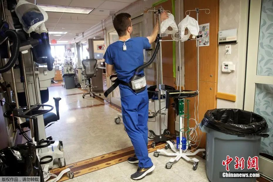 资料图:当地时间11月18日,美国威斯康辛州麦迪逊华盛顿大学卫生大学医院,医护人员在进入新冠肺炎患者病房前,佩戴电动空气净化呼吸器。