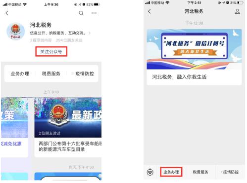 1.微信中搜索“河北税务”,点击“关注公众号”;进入公众号后,点击左下方的“业务办理”。