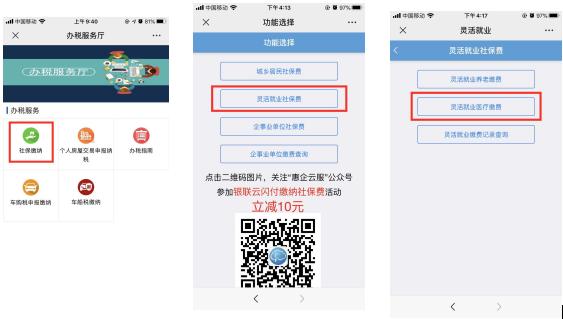 1.微信公众号缴费。关注“河北税务”微信公众号,通过 “业务办理”—“社保缴纳”—“灵活就业社保费”—“灵活就 业医疗缴费”模块申报缴纳,手机端缴费流程详见附件 1。