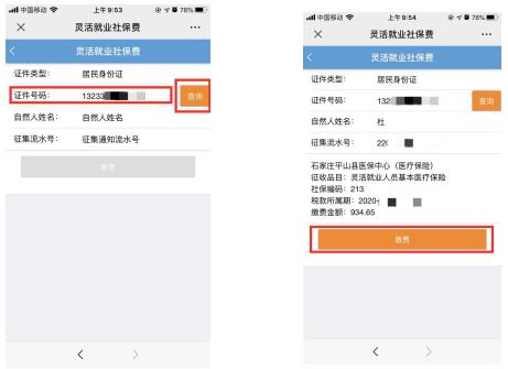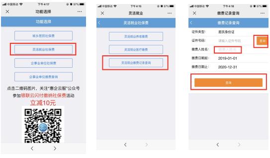 缴费查询。选择“灵活就业社保费”—“灵活就业缴费记录查询”,输入身份证号,点击右侧“查询”按钮,自动带出自然人姓名。点击下方“查询”按钮,即可查询缴费记录。