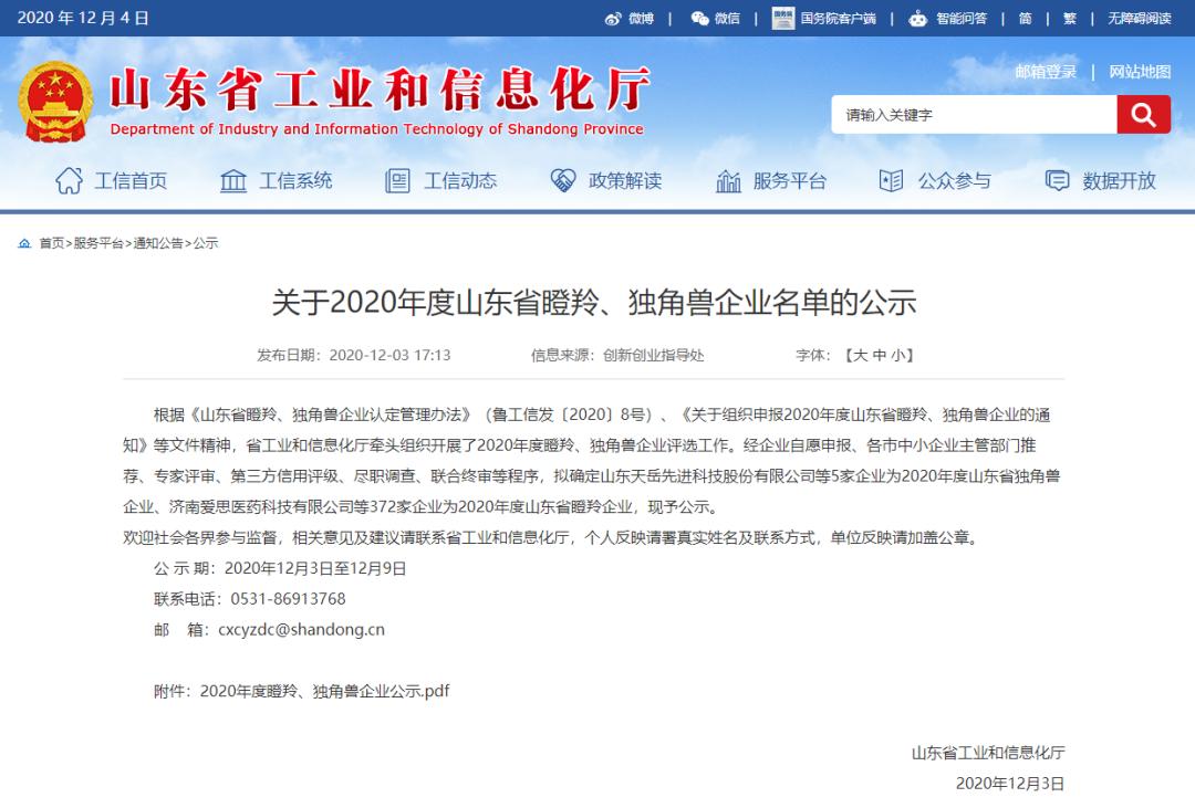经企业自愿申报、各市中小企业主管部门推荐、专家评审、第三方信用评级、尽职调查、联合终审等程序,拟确定山东天岳先进科技股份有限公司等5家企业为2020年度山东省独角兽企业、济南爱思医药科技有限公司等372家企业为2020年度山东省瞪羚企业,现予公示。