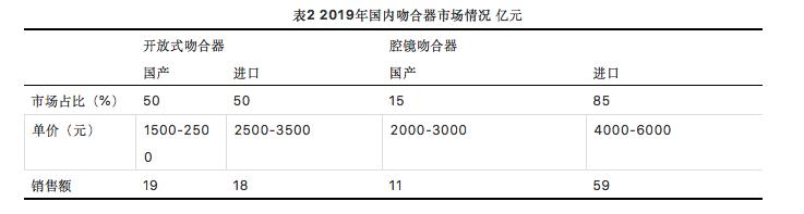 市场竞争格局方面,目前国内整个吻合器市场仍由外资主导,2019年进口吻合器占据整体市场的70%左右。其中,腔镜手术吻合器由于技术水平较高,因此进口替代率最低,外资品牌市场占比超过85%。而在开放吻合器领域,国产品牌经过多年的努力已经获得了50%的市场份额,进口和国产价格趋近,进入红海竞争。