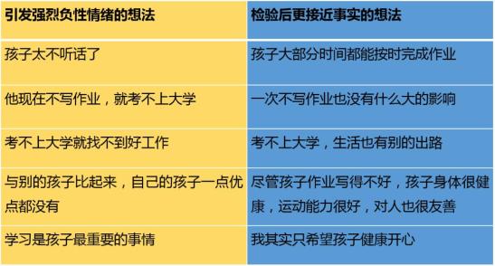 很多时候,情绪都是由想法引起的,而不是事件本身。在强烈情绪的驱动下,我们往往把想法当成事实,沉浸其中。比如遇到孩子不写作业,我们的想法可能是“孩子太不听话了”、“不写作业以后考不上好大学”等等。那么,我们要检验一下这个想法是不是符合事实,想想有没有其他可能的解释,是否只是假想了一个威胁,如果所假想的灾难真的发生了,我是否可以应对?比较理性的想法是什么样的?我们可以试着检验一下: