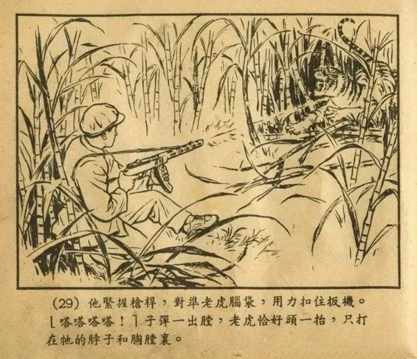 1953年福建仙游,一个孩子在甘蔗地里遭老虎袭击,闻讯赶来的解放军战士李富来,手持波波莎冲锋枪进入甘蔗地追杀两头老虎。