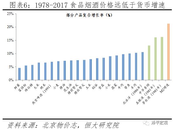 以食品烟酒、轻纺工业品为代表的实物商品在改革开放以来价格涨幅有限,远低于货币增速。改革开放以来,伴随我国生产技术提升,生产规模扩大,对外开放程度加深,商品市场竞争较为激烈、替代品繁多,食品烟酒、轻纺工业品价格涨幅有限。1978-2017年,北京各类食品烟酒、轻纺工业品样本平均复合增速分别为8.7%、1.93%,远低于同期广义货币M2增速21.3%。其中,高档烟酒领涨食品烟酒类别商品,年均复合增速达15.12%。我们认为,高档烟酒涨幅相对较高与其具有垄断性质以及消费升级有关。
